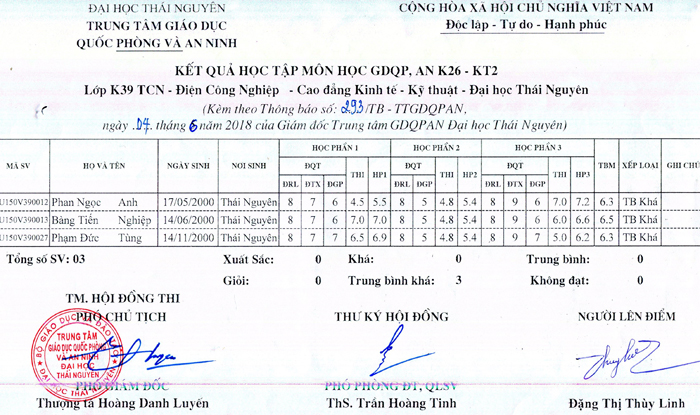 Kết quả học tập môn học GDQP, AN K12 (K26-KT2)